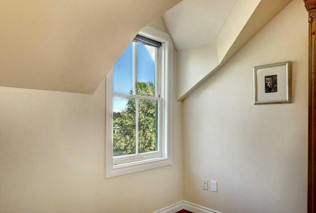 Inside, you’ll find three bedrooms and one and a half bathrooms, a graceful spindle staircase with ornamental wainscoting, and a stunning antique light fixture in the living room. The dining room, highlighted by a stone fireplace and vaulted ceiling, overlooks the beautiful south-facing backyard and deck. The antique buffet in the dining room can be included for additional cabinetry and other antiques could be negotiated also. The main floor includes a washer and dryer, quality kitchen appliances, and a butcher-block countertop. Natural light streams throughout the home from every direction, even through skylights in the stairwell and bathroom—so the stars can shine through at night.