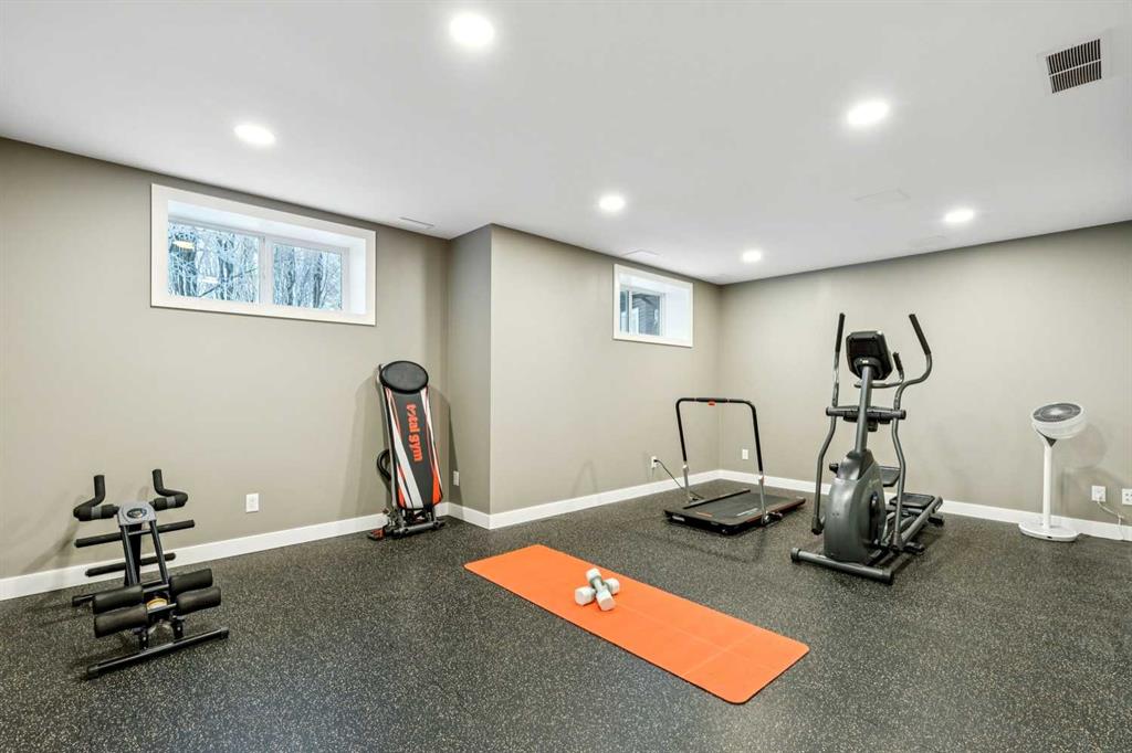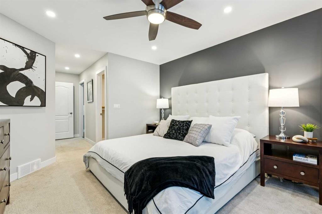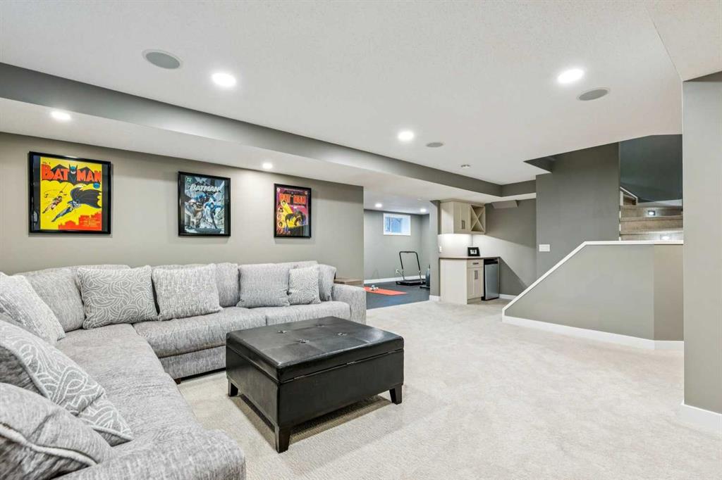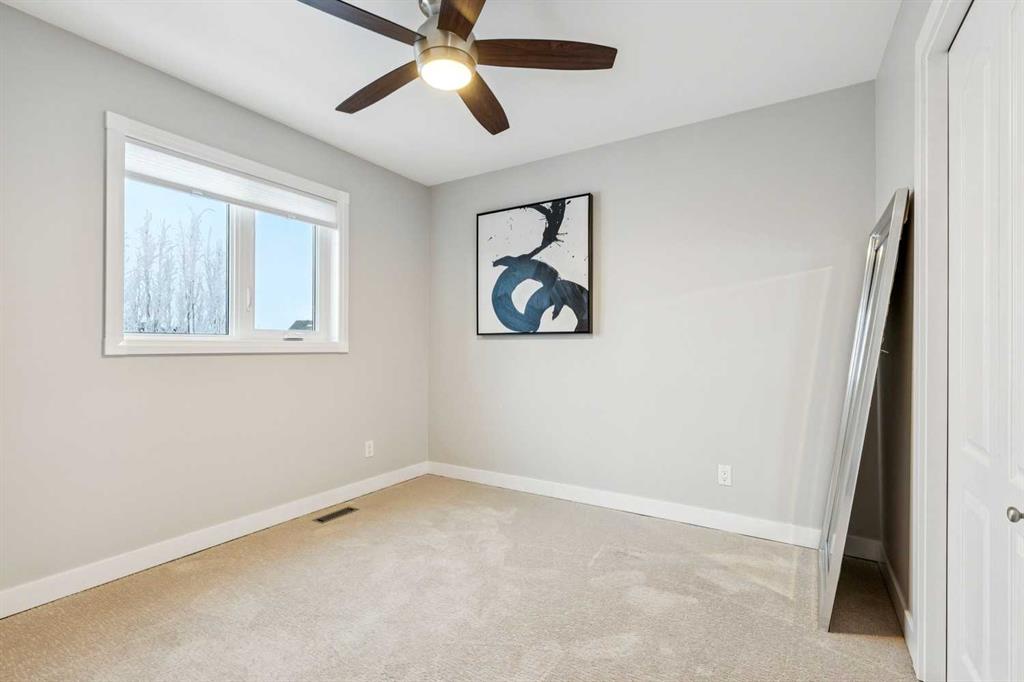 Upstairs in the home, the primary bedroom comfortably fits a king-sized bed and features a ceiling fan, walk-in closet with built-in shelving, and a spa-inspired ensuite with soaking tub and walk-in shower. Two additional bedrooms, each with ceiling fans, share a full bathroom. The open stairwell and custom interior railing create a bright, airy connection to the main floor below. The fully finished basement extends the living space with stair lighting for safety, a bar area complete with included bar fridge, fresh paint throughout, and multiple large areas ideal for a family room, home gym, or hobby space, along with a den and a 3-piece bathroom. Comfort and efficiency continue with a new furnace and A/C installed in August 2024, a Kinetico water softener with full water filtration and reverse osmosis system, and a B-hyve smart watering system to support the expansive yard.