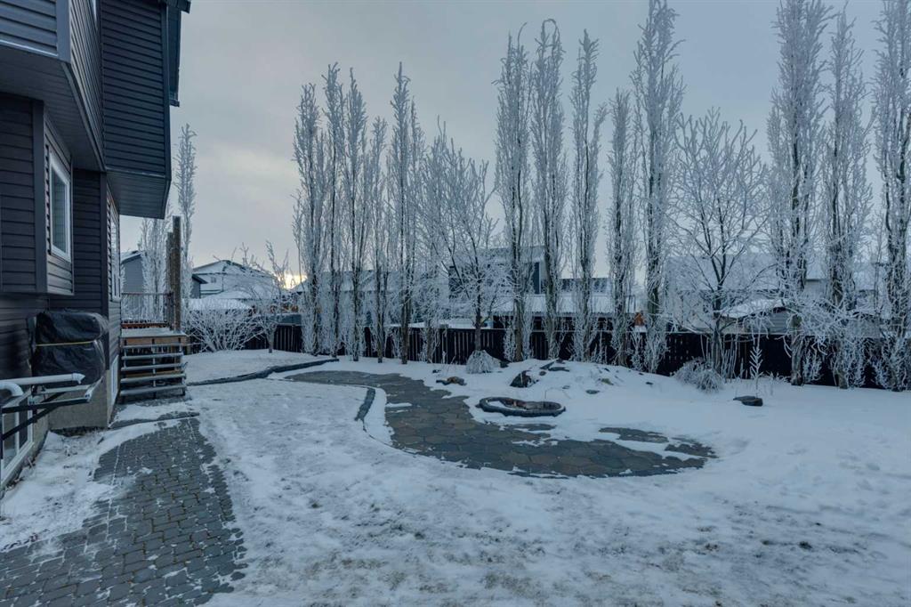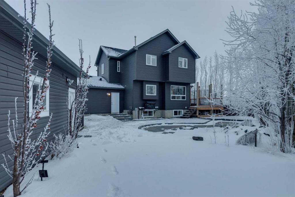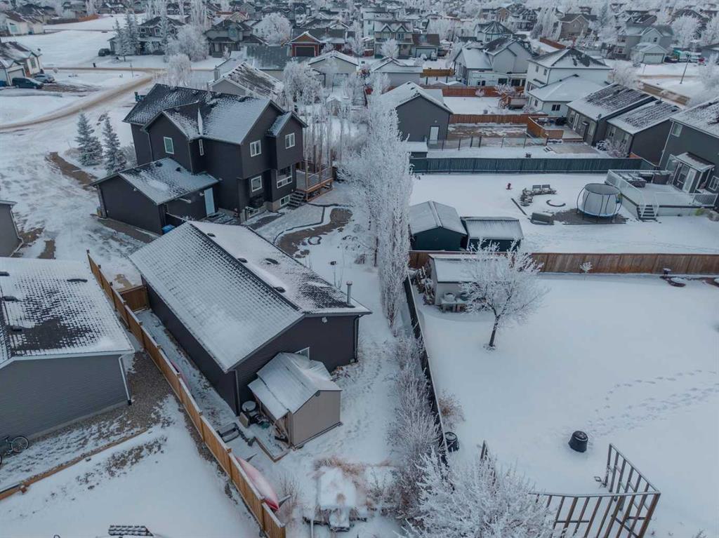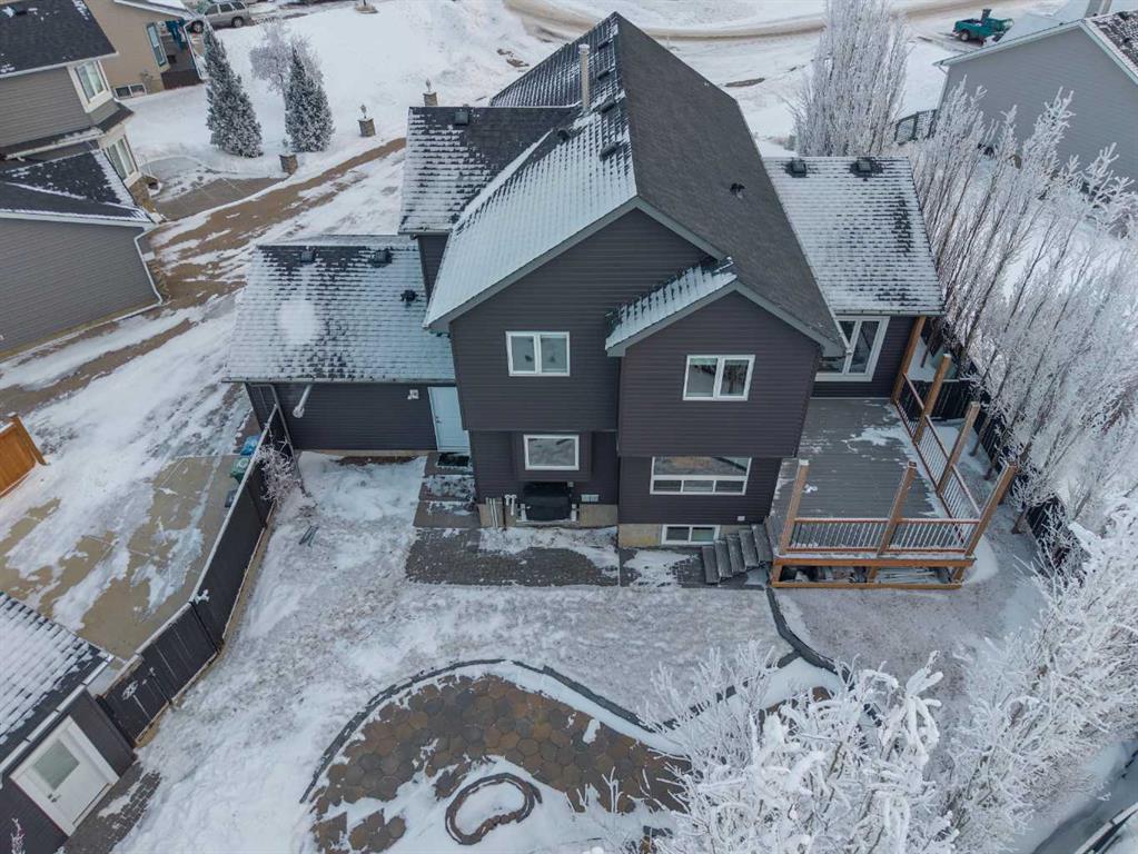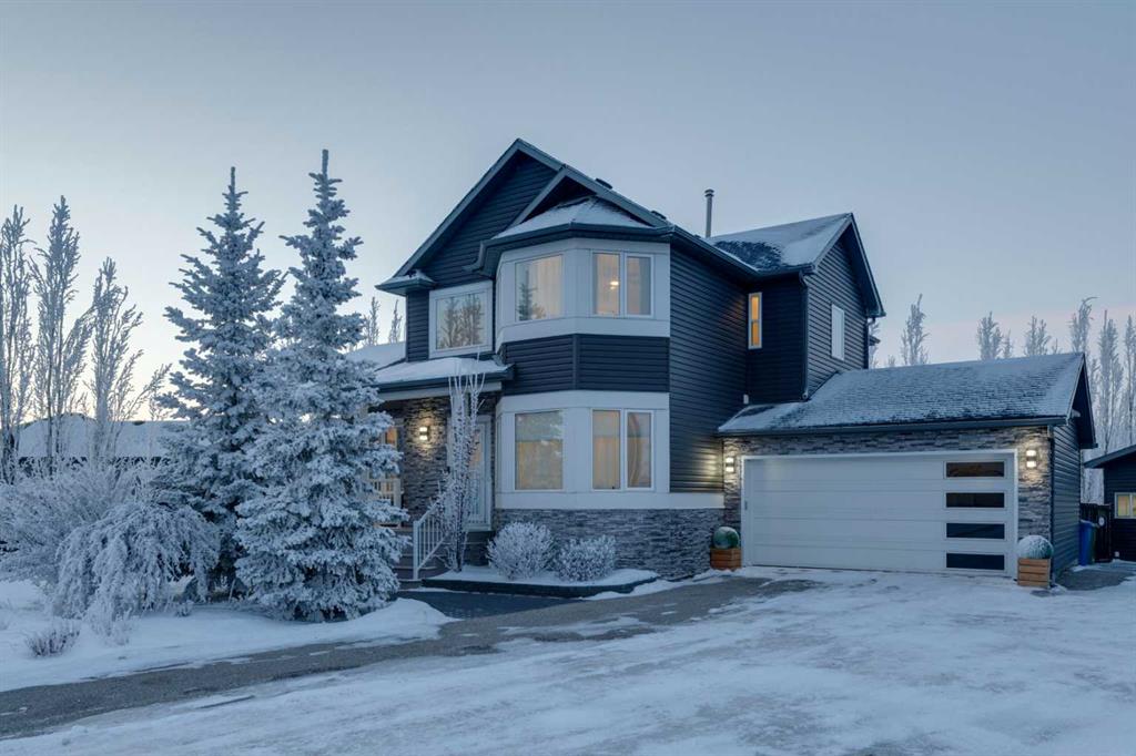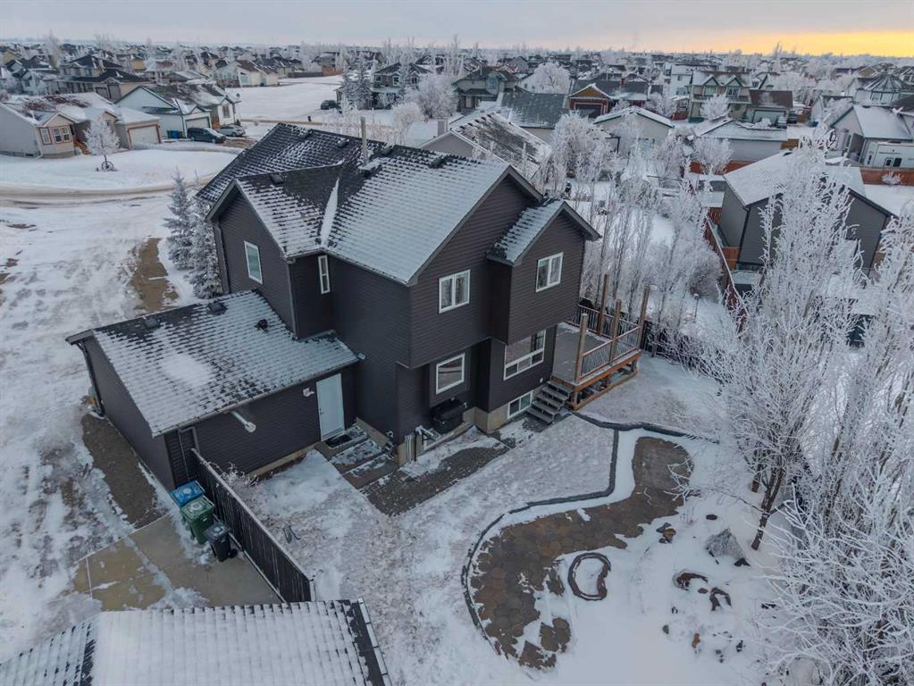 ~ DETACHED QUAD GARAGE ~ 1/4 ACRE LOT ~ Welcome to 5 Henderson Bay in Langdon, a thoughtfully upgraded home set on a 1/4 acre oversized lot that offers space, comfort, and standout functionality inside and outside! Curb appeal shines with a modern composite front porch and back deck, completed with custom railings and gate, creating an inviting space to relax and enjoy the neighbourhood. Inside, the open-concept main floor is bright and welcoming, with Windowmart windows (2022) flooding the home with natural light and improved efficiency, complemented by upgraded attic insulation brought to R50. The living room is anchored by a gas fireplace featuring a newly completed surround and mantle, flowing seamlessly into the dining area with easy access to the backyard for indoor-outdoor living. The kitchen is designed for both everyday use and entertaining, offering generous counter space, pantry storage, under-mount cabinet lighting, and updated appliances including a Samsung dishwasher with transferable extended warranty. A private main-floor office with French doors and a large front-facing window adds flexibility, while the spacious laundry room includes a sink, built-in storage, and a convenient chute from the primary closet, paired with a powder room and direct access to the attached garage.