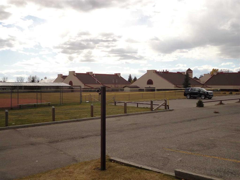 This 614 sq. ft. main floor (no stairs to climb) one-bedroom apartment-style condominium is ideally situated in a quiet residential community, backing onto a school field with southern exposure and unobstructed rear views. The property features a series of recent upgrades including new vinyl flooring with enhanced underlay, fresh paint, new doors, partially updated lower kitchen cabinets, a new refrigerator, window coverings, countertops, toilet, shelving storage racks, and freshly painted door trim. As a corner unit, it benefits from an additional window between the living and dining areas, ensuring ample natural light throughout. The interior includes a split brick feature wall, a spacious living room with patio doors leading to a balcony, and both the bedroom and living room overlook a green space. The dining area adjoins the galley kitchen, while an updated four-piece bathroom is conveniently located off the main entryway. Additional amenities include in-suite storage and two surface parking stalls. This residence offers an excellent opportunity for young couples, seniors not wanting stairs or single professionals seeking comfort and convenience in a well-maintained setting. Walking distance to Starbucks, Safeway, Dollarama and many other convenient amenities. Also located close to the North end of Okotoks for closer access to Calgary for the commuter.