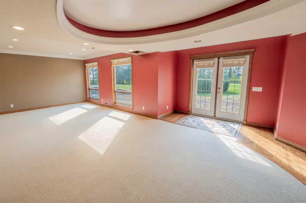 Car enthusiasts and hobbyists will appreciate the heated, insulated four-car attached garage, offering abundant space and functionality. Outdoors, mature perimeter trees provide rare privacy, while the gently sloping landscape leads to private retreats, garden areas, and a water dugout that doubles as a charming skating rink in winter.
