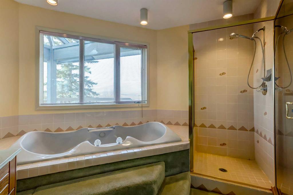 The home itself is solid and well-built, offering an excellent layout ready for renovation and personalization. The large kitchen enjoys mountain views, a cooktop island, four newer windows, above average amount of storage, and a built-in desk area. A few steps down, the living room features a stone-faced wood-burning fireplace and city views through its large windows. The primary bedroom includes a walk-in closet and 5-piece ensuite with a soaker tub, while the main-floor laundry offers a convenient sink and access to the double car attached, drywalled garage.