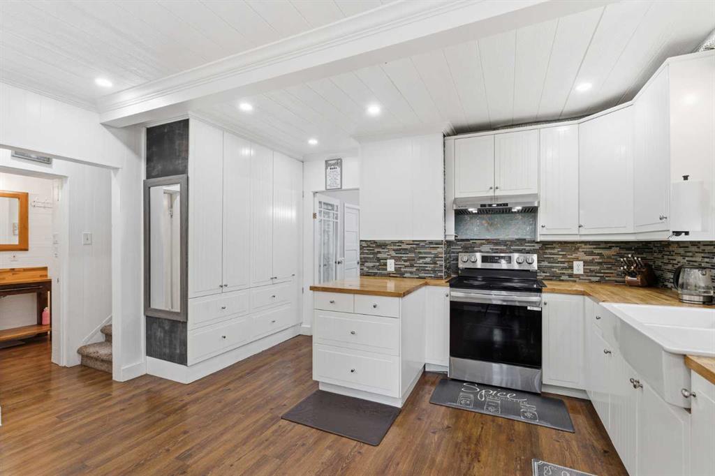 The home features thoughtfully selected farmhouse-inspired finishes, including reclaimed elements sourced from historic sites. The well-appointed kitchen includes stainless steel appliances, ample counter space, and extensive cabinetry, providing both functionality and style. The adjoining dining room offers a warm and inviting space for family gatherings and special occasions.