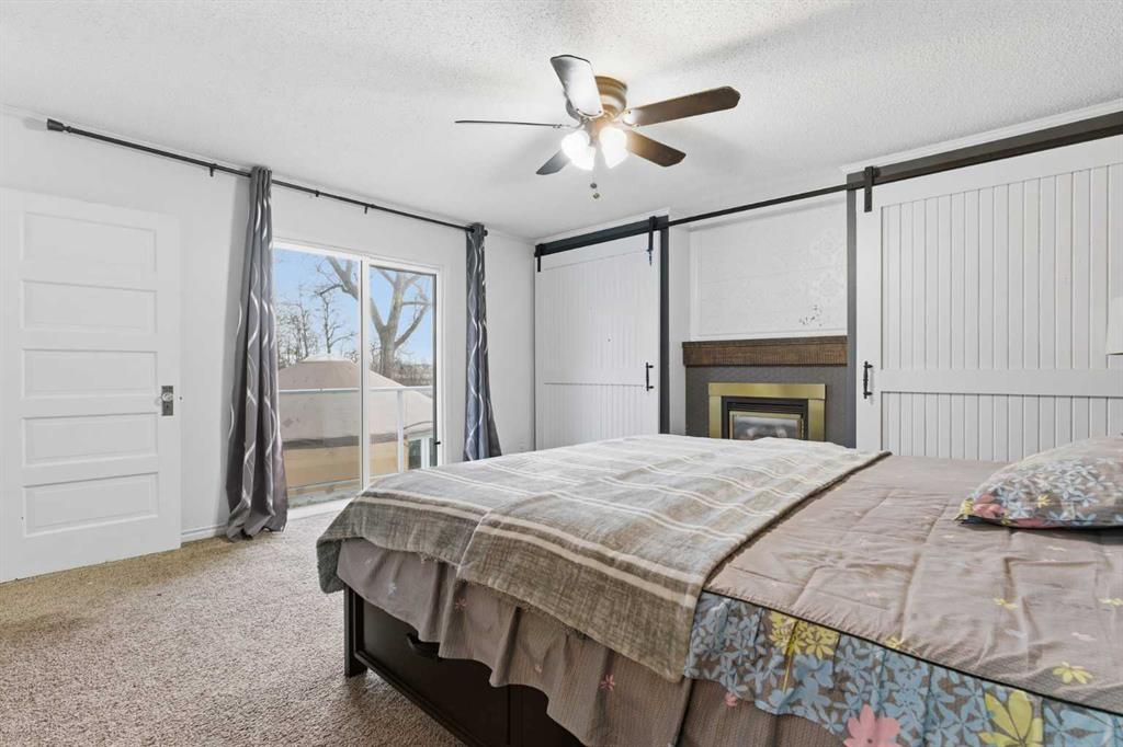 The upper level hosts a charming primary bedroom with double barn-door closet access, a gas fireplace, and a private balcony overlooking the treed landscape — the perfect spot for morning coffee or quiet reflection. A second bedroom, flex room, and spacious 5-piece bathroom complete this level. The finished lower level offers a large multi-purpose space, an additional bedroom with 2-piece bathroom (macerating toilet), and direct walk-up access to the outdoors.The fully developed lower level offers exceptional additional living space, featuring a bedroom, a 2-piece bathroom (macerating toilet), a large recreation room, storage area, and direct walk-up access to the outdoors, making it ideal for guests, teens, or multi-use living.