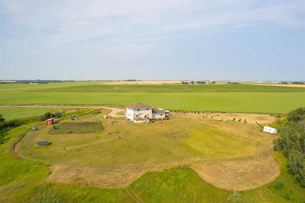 This beautiful 2,500 sq. ft. two-storey home, built in 2020, is located on a sprawling 50.14-acre parcel just East of Olds on Highway 27. As you enter, you're welcomed by an open concept layout with 9-foot ceilings. The living room features a cozy gas fireplace, perfect for those chilly evenings. The kitchen boasts ample cabinetry, a large walk through pantry, a movable island, and access to an East facing deck showcasing gorgeous views of the ravine. The main floor also includes a mudroom with laundry, a 2 pce bathroom, large bedroom with 4 pce ensuite with walk in closet (could be used as a main floor master) and access to a large attached garage (24x31). Upstairs, you'll find a spacious family room, ideal for kids or a secondary living area, along with four bedrooms. The master bedroom offers a spa like ensuite with a separate tub and shower. The upstairs is completed with a 4 pce main bathroom. The home includes a total of five bedrooms and 3.5 bathrooms, providing plenty of space for family and guests. The full, unfinished basement is framed and ready for your personal touch, with a roughed in bathroom and utility room featuring an oversized hot water tank and water softener. Outside, enjoy the tranquility of a garden area, fruit trees, raspberries and a natural treed area in the coulee, making this home very private. The property currently has 19 +/- cultivated acres producing and recent addition of a 16 x 24 Garage on skids. You don't want to miss calling this property your own!! Book your showing today!!