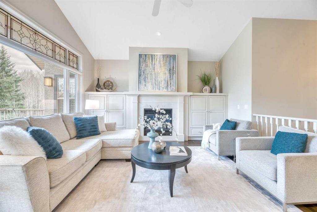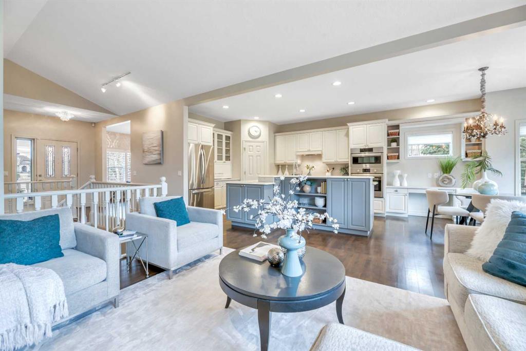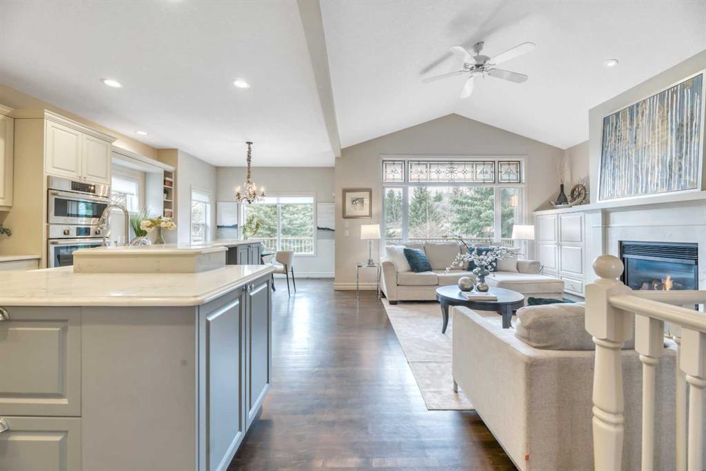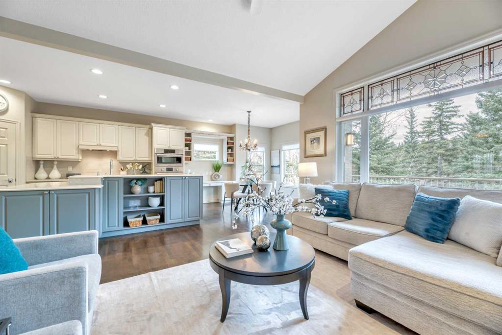 The bright, open-concept main floor is filled with natural light from expansive windows and showcases vaulted ceilings,