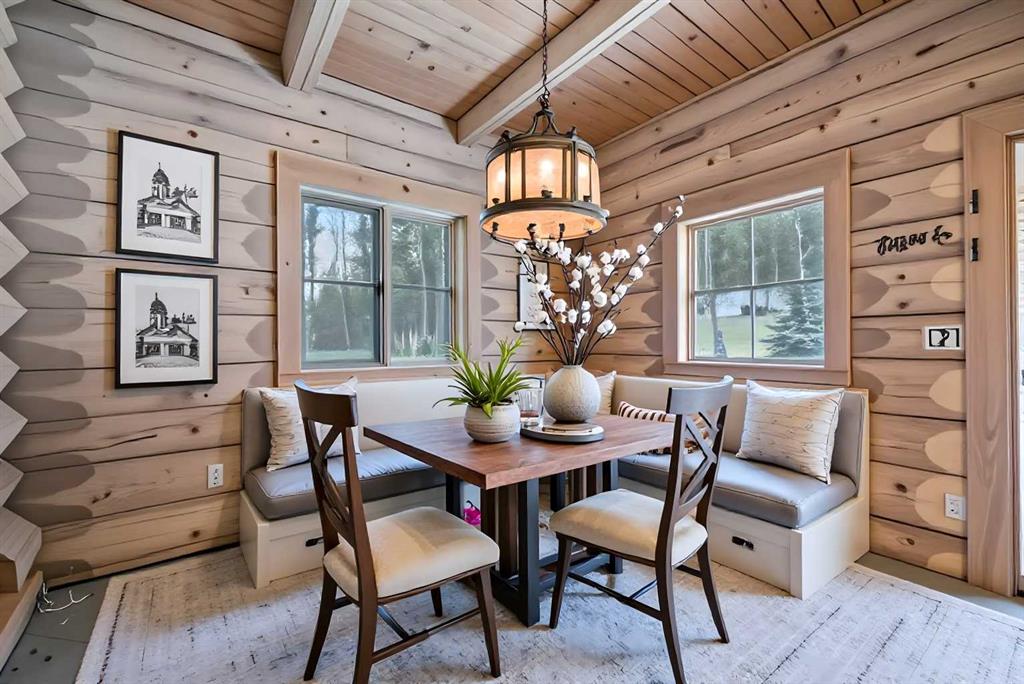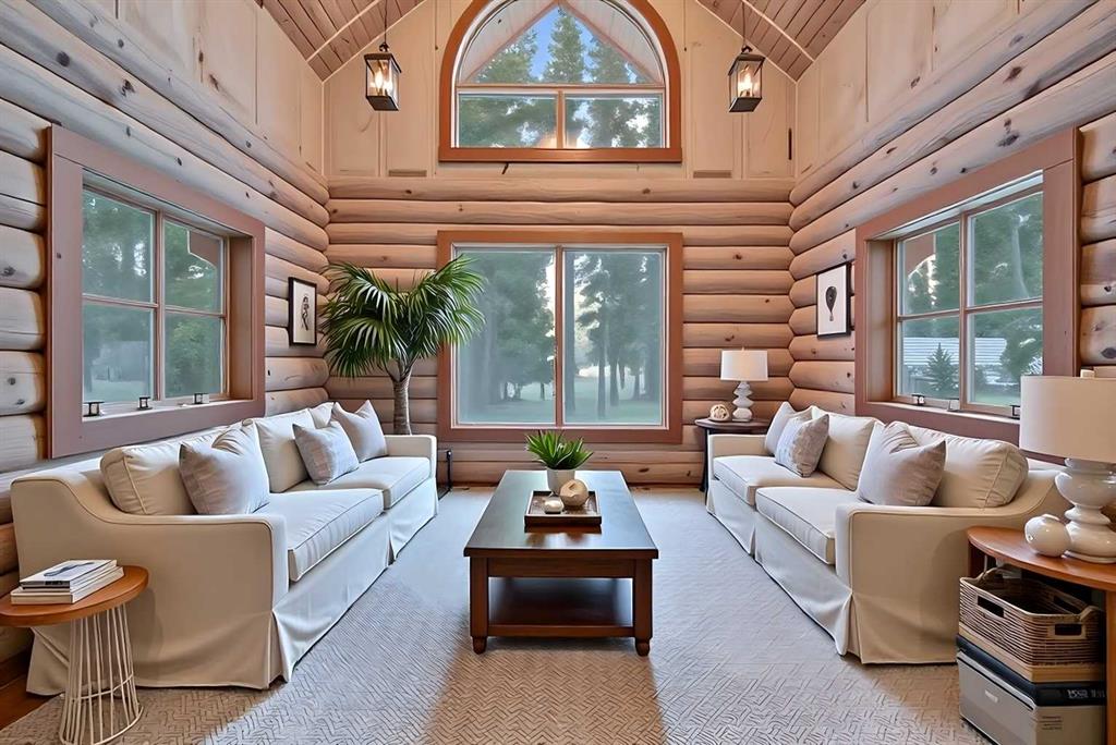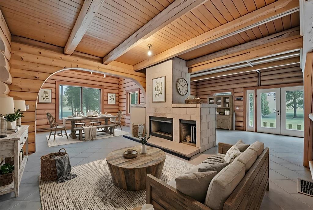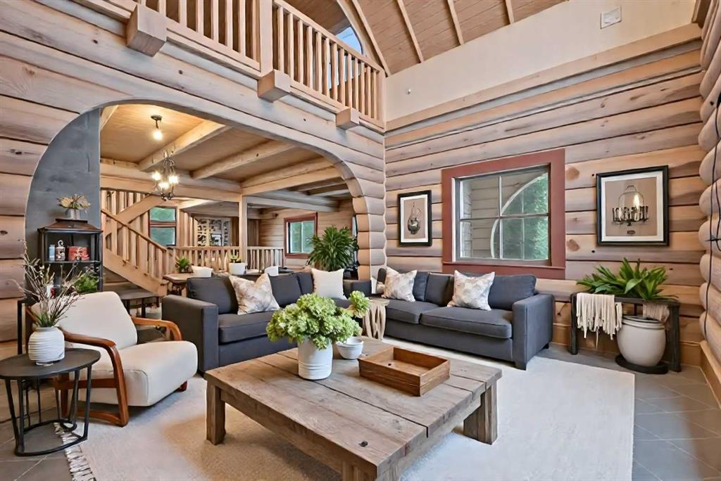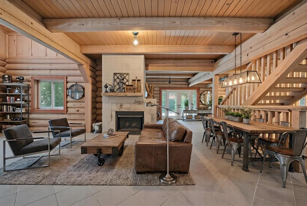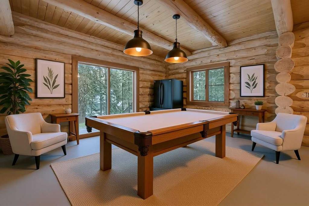 Additional features include a heated double garage, interior logs professionally dry ice–treated on the interior, a 20-year-old roof, and a pool table included with the sale.
