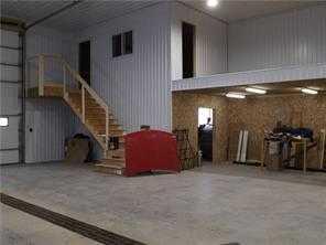 The impressive 48' x 64' x 18' shop is thoughtfully designed with future expansion in mind, including plumbing rough-ins for a bathroom and kitchenette, in-floor heating setup ready for a boiler, extensive electrical, and excellent lighting. It also features two large doors, an office space, and a catwalk leading to additional storage or office area.